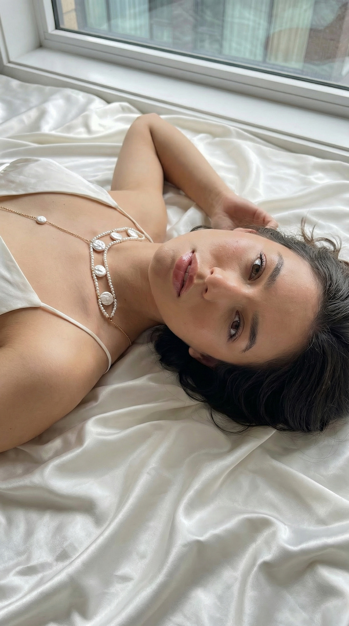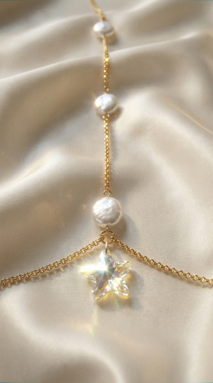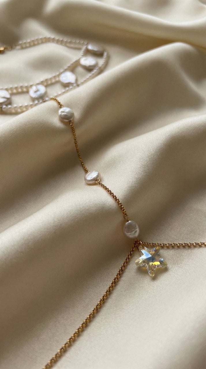 Aeliana to body chain utkany z mlecznych pereł i złota, zakończony kryształową rozgwiazdą, która odbija światło jak kropla wody zatrzymana w ruchu. To biżuteria, która porusza się z Twoim ciałem, subtelnie podkreślając każdy gest.