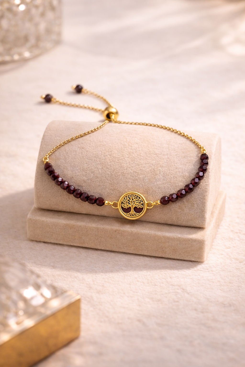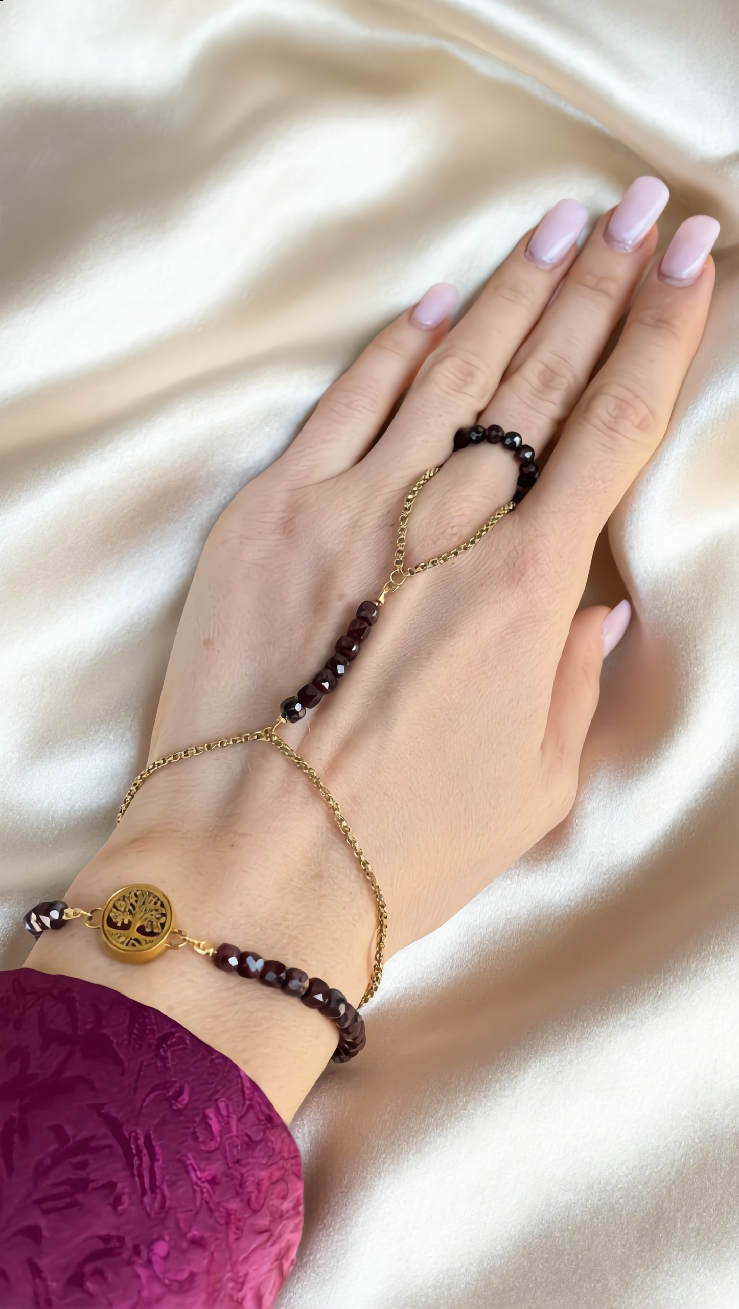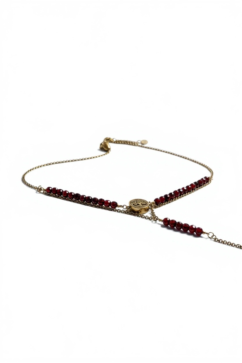 Bransoletka z granatem to połączenie głębokiej barwy naturalnego kamienia, subtelnej elegancji i symboliki zakorzenionej w kobiecej sile. Ręcznie wykonana z naturalnych granatów oraz pozłacanej stali nierdzewnej, została zaprojektowana jako delikatny, ale wyrazisty akcent nadgarstka.