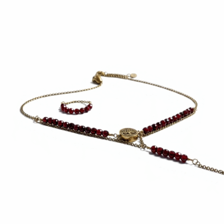Całość dopełnia medalik z motywem Drzewa Życia, pełniący funkcję aromatyczną. W jego wnętrzu znajduje się miejsce na kroplę olejku, dołączonego do biżuterii.