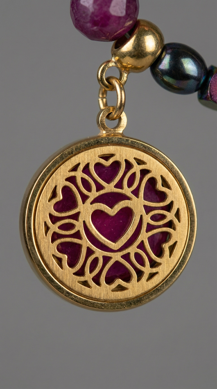 Centralnym punktem bransoletki jest aromatyczny dyfuzor, który możesz wypełnić ulubionym zapachem – olejkiem eterycznym, perfumami lub specjalnie dobraną kompozycją. To zapach staje się Waszym osobistym kodem, który przywołuje wspomnienia i emocje, gdy tylko go poczujesz.