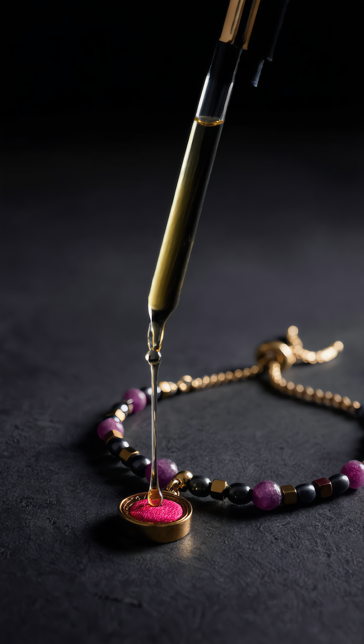Do bransoletki dołączony jest olejek, przeznaczony do użycia w medaliku. Subtelny zapach towarzyszy noszeniu biżuterii jako stały, dyskretny element doświadczenia.