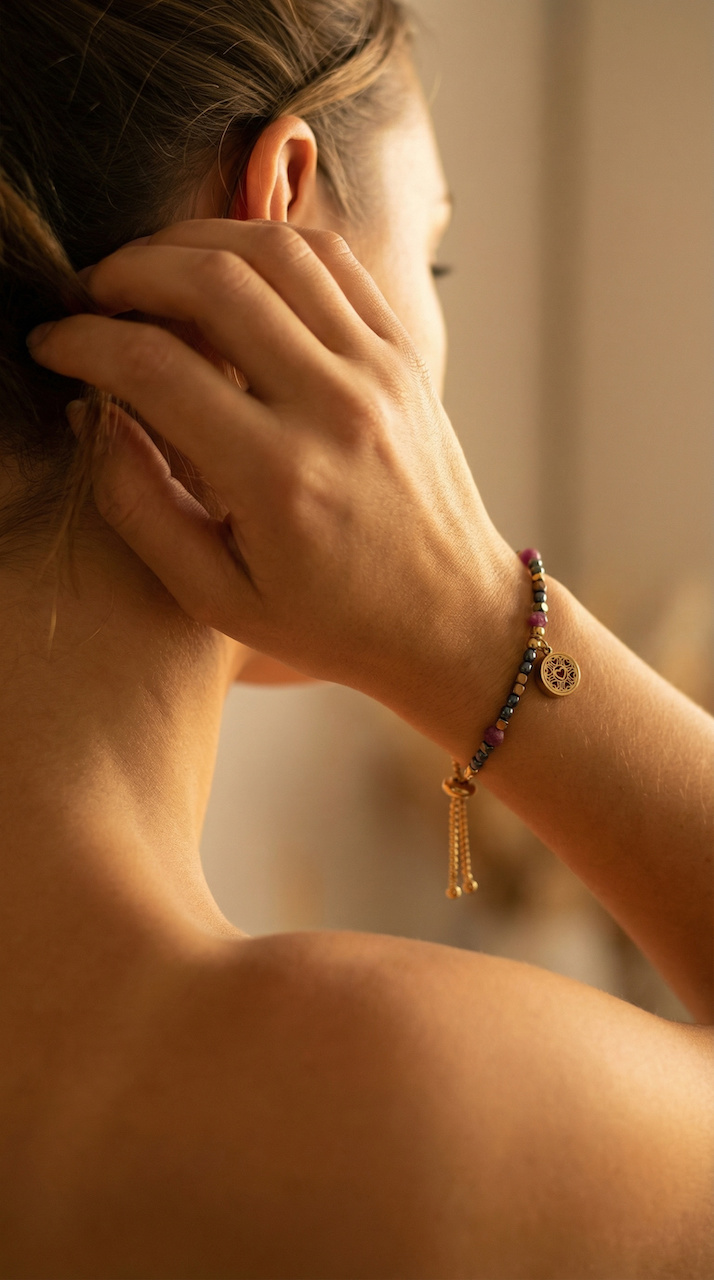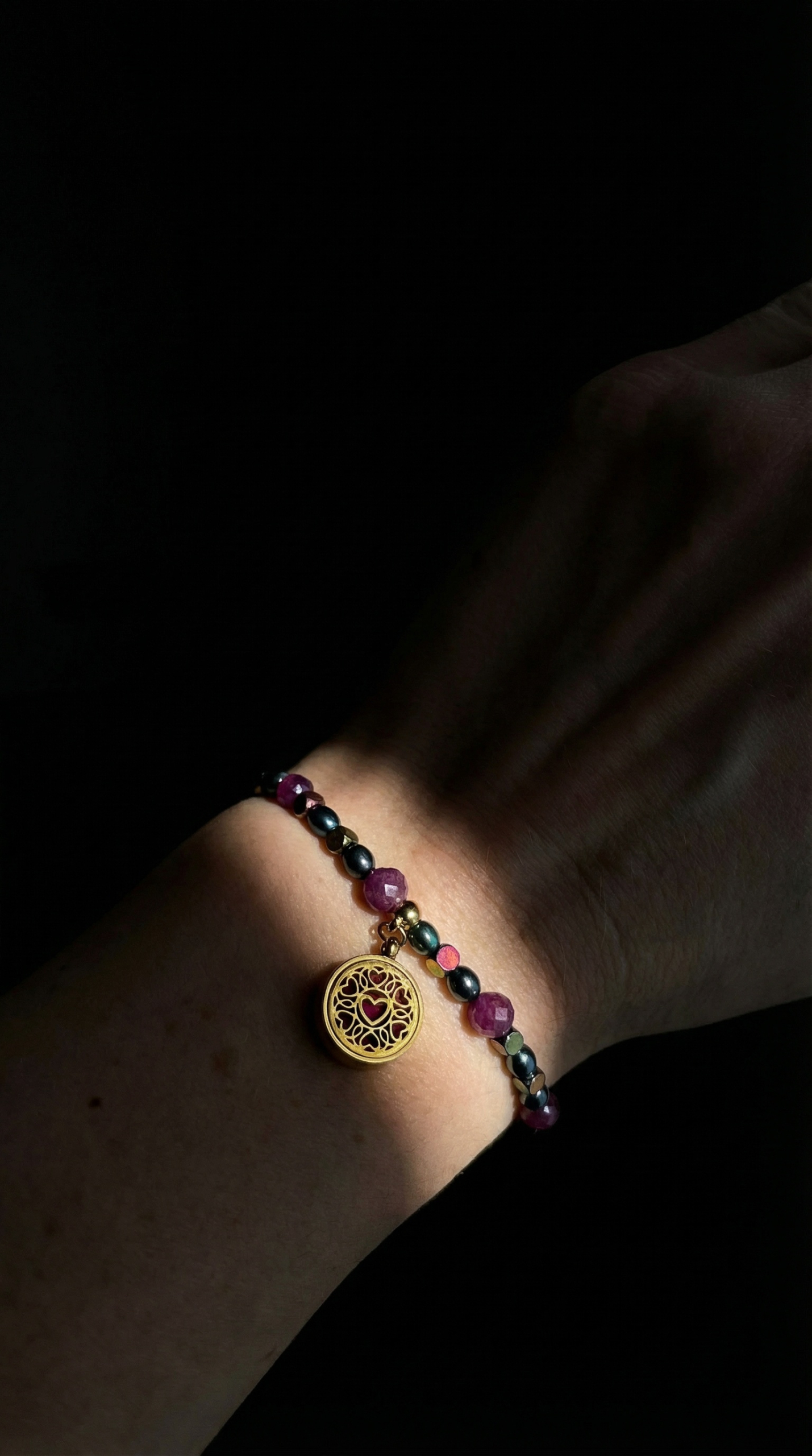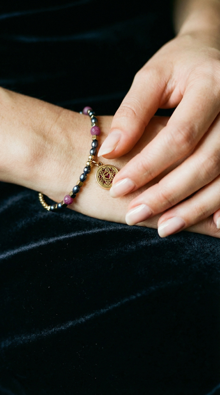 Ta bransoletka to coś więcej niż biżuteria. To intymny rytuał, który przypomina o bliskości, nawet gdy dzielą Was kilometry. Rubin, ciemna perła, hematyt i ciepłe złoto pozłacanej stali tworzą kompozycję, która mieni się subtelną paletą barw – od głębokiej czerwieni po tajemniczy blask nocy.