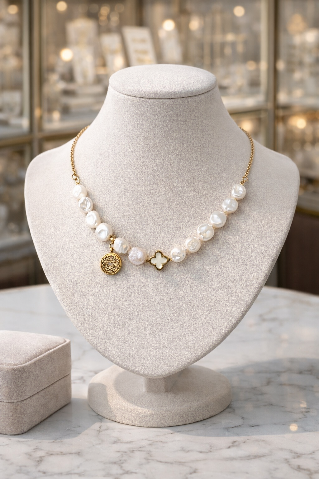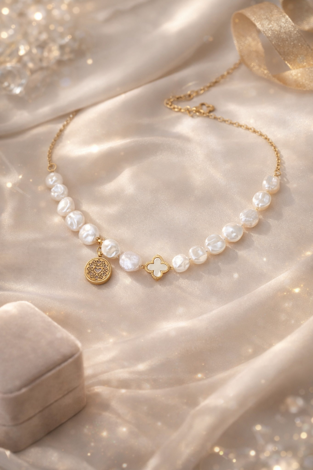 •wykonany z naturalnych pereł i stali nierdzewnej pozłacanej