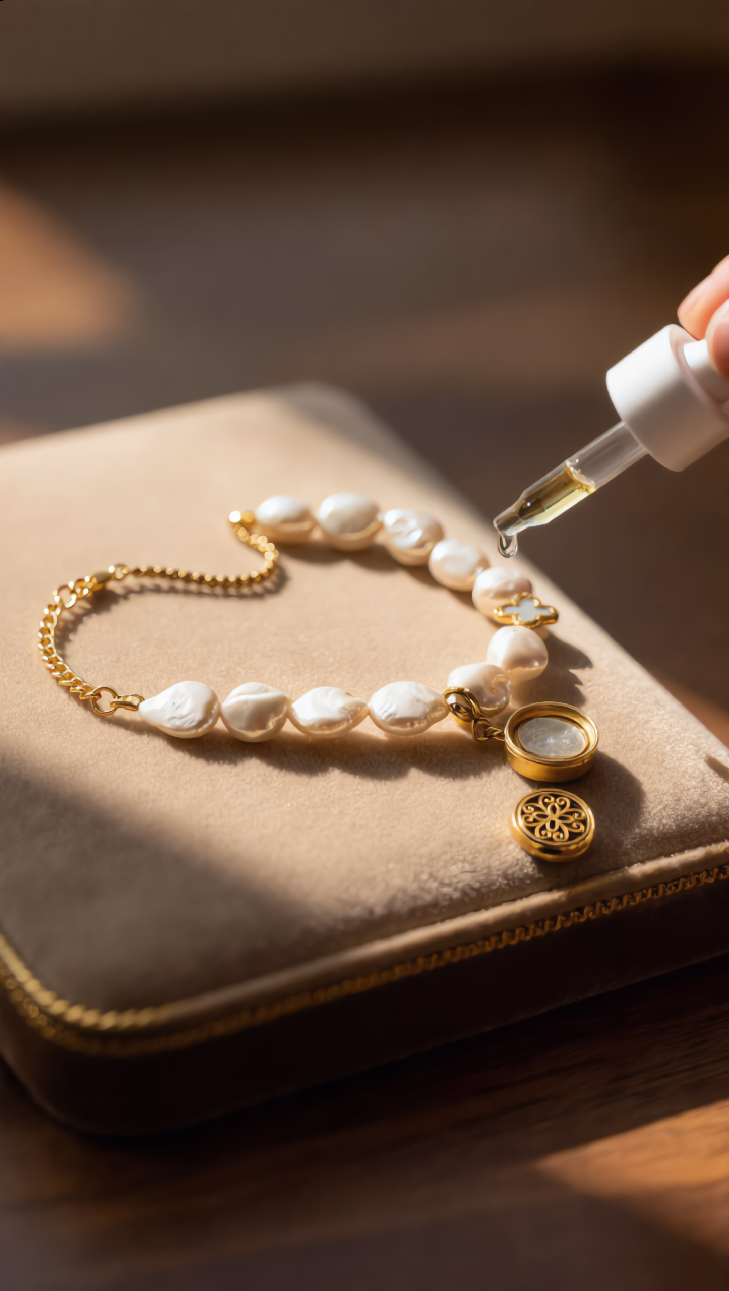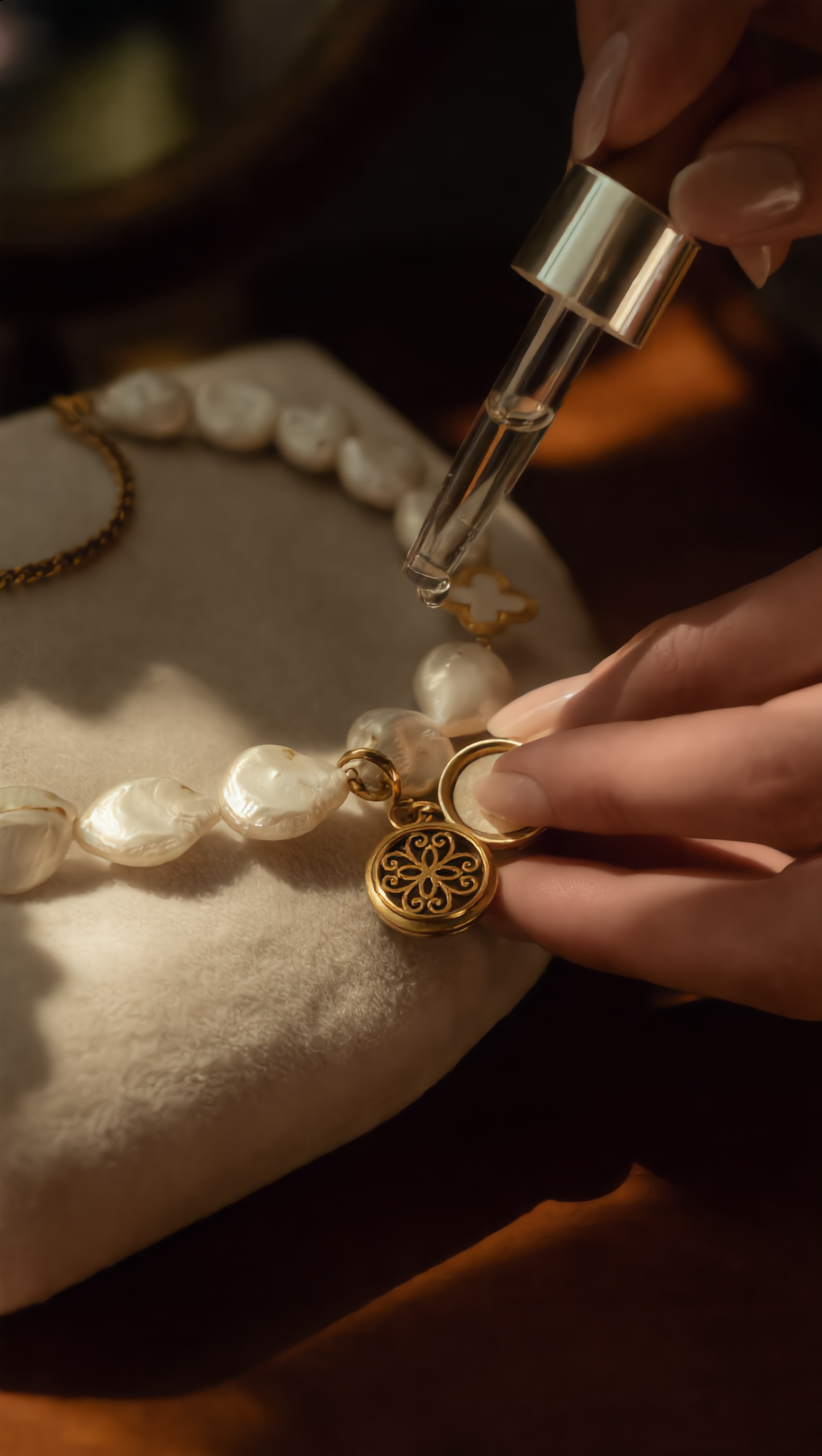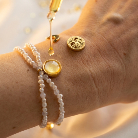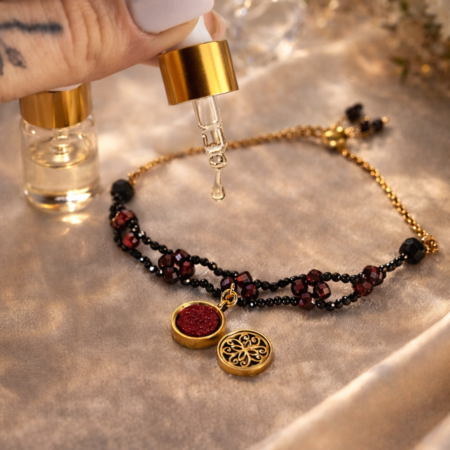 Centralny medalik pełni nie tylko funkcję ozdobną, ale również aromatyczną. W jego wnętrzu znajduje się miejsce na kroplę olejku, dołączonego do zestawu. Zapach towarzyszy ruchowi ciała i oddechowi, tworząc intymny, kobiecy rytuał noszenia biżuterii.