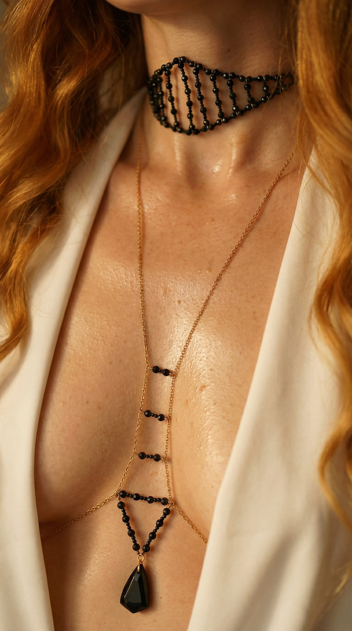 Naszyjnik na ciało delikatnie opada na skórę, akcentując Twoje kształty, a choker otula szyję, dodając Ci szyku i gracji. Noś je razem lub osobno, w zależności od nastroju i okazji. Poczuj, jak Nyx budzi w Tobie boginię nocy.