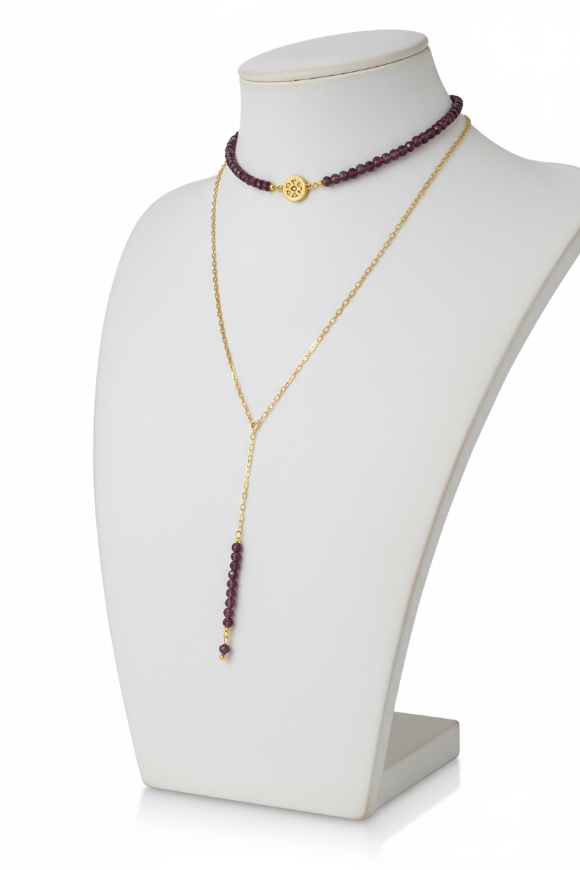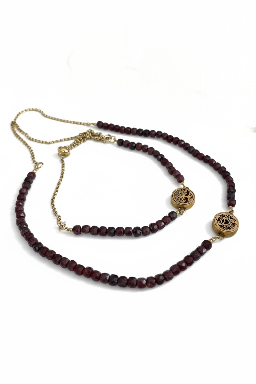 Zestaw Essential Granat to biżuteria, która łączy zmysłowość, energię kamieni i subtelność aromaterapii. Ręcznie wykonany z naturalnych granatów i pozłacanej stali nierdzewnej, został stworzony jako osobisty talizman – elegancki, głęboko symboliczny i funkcjonalny.