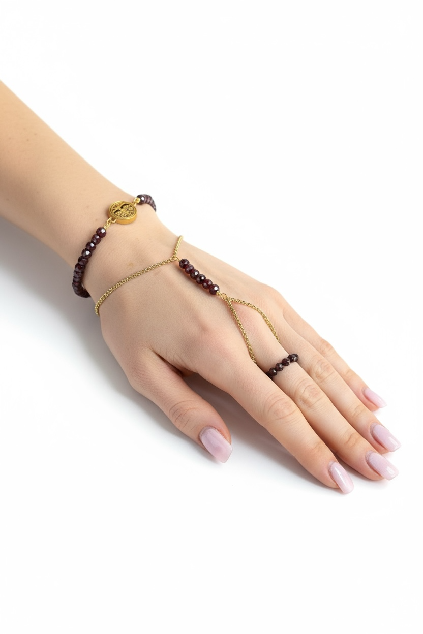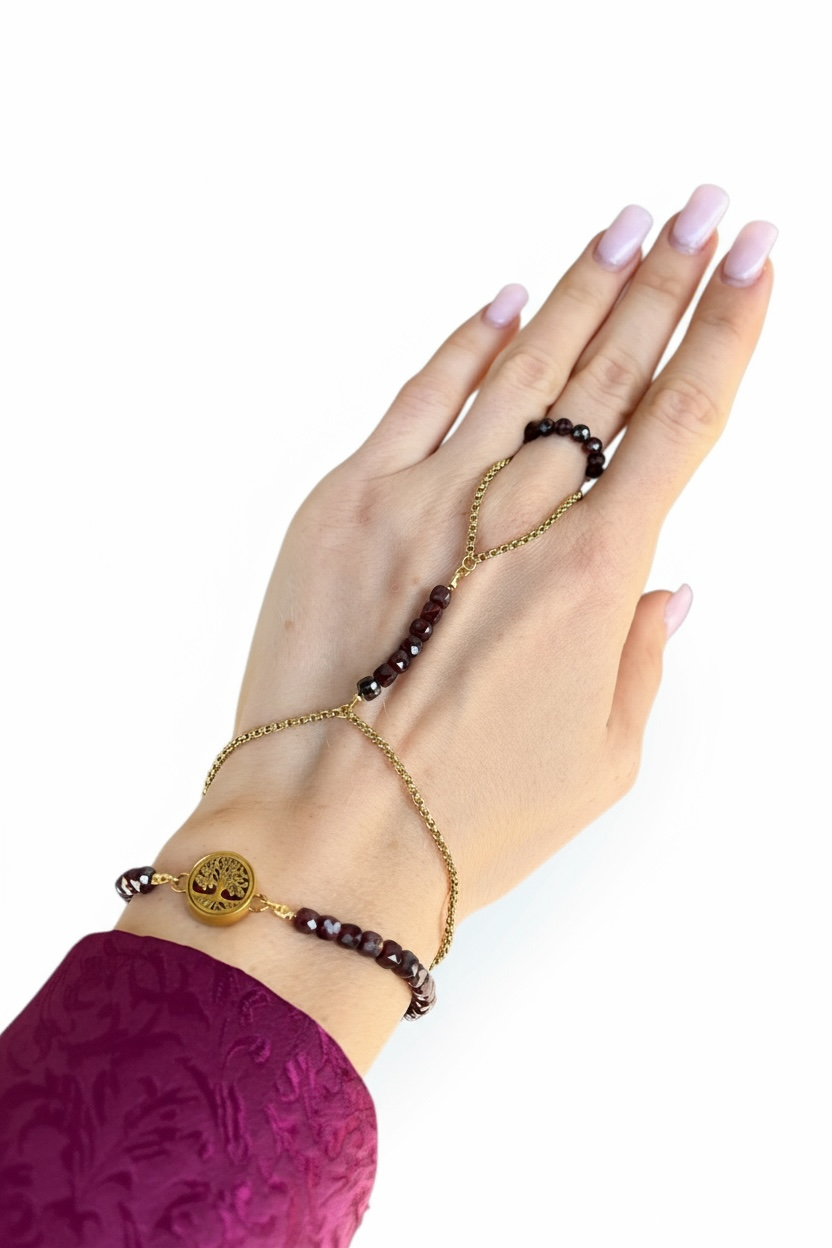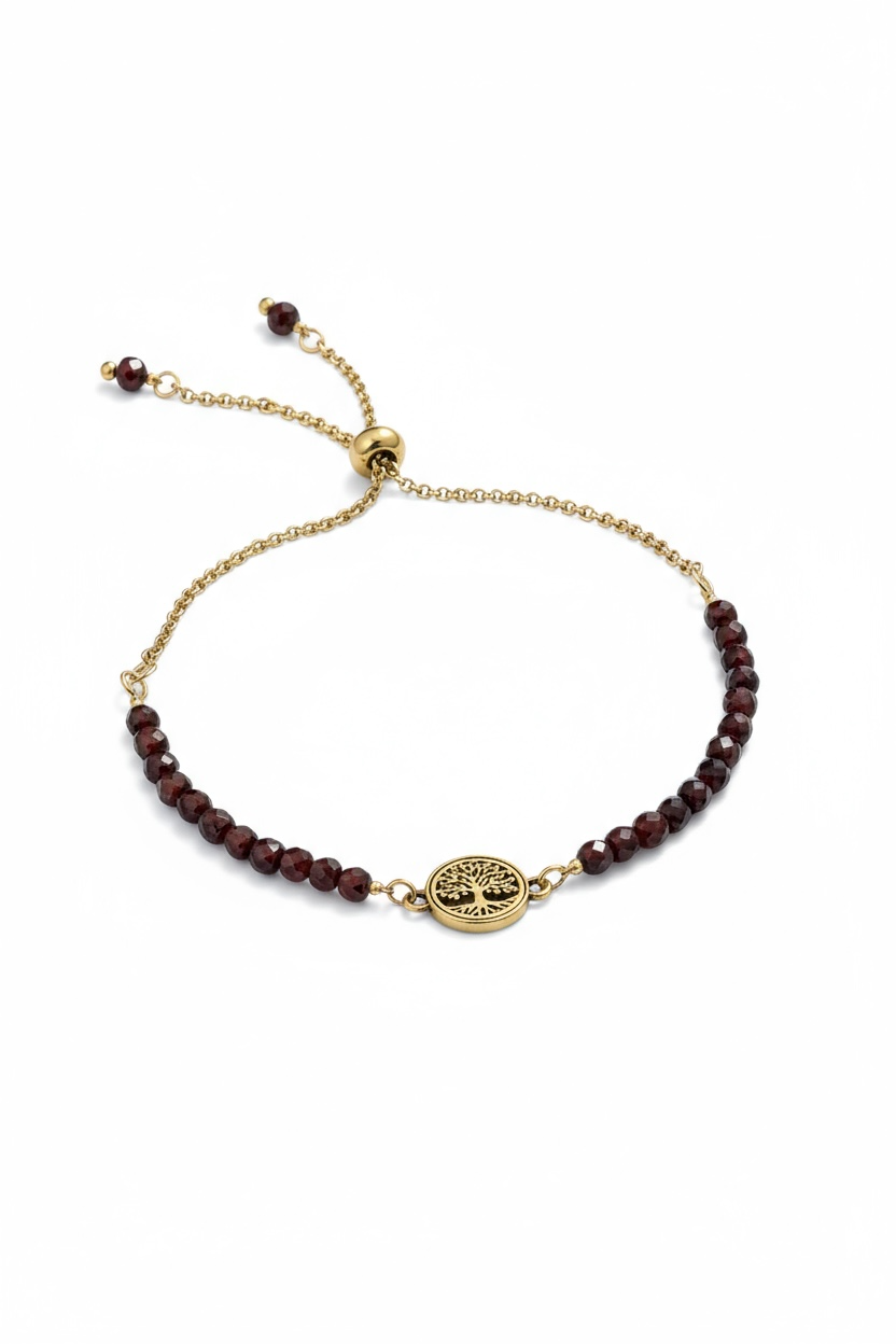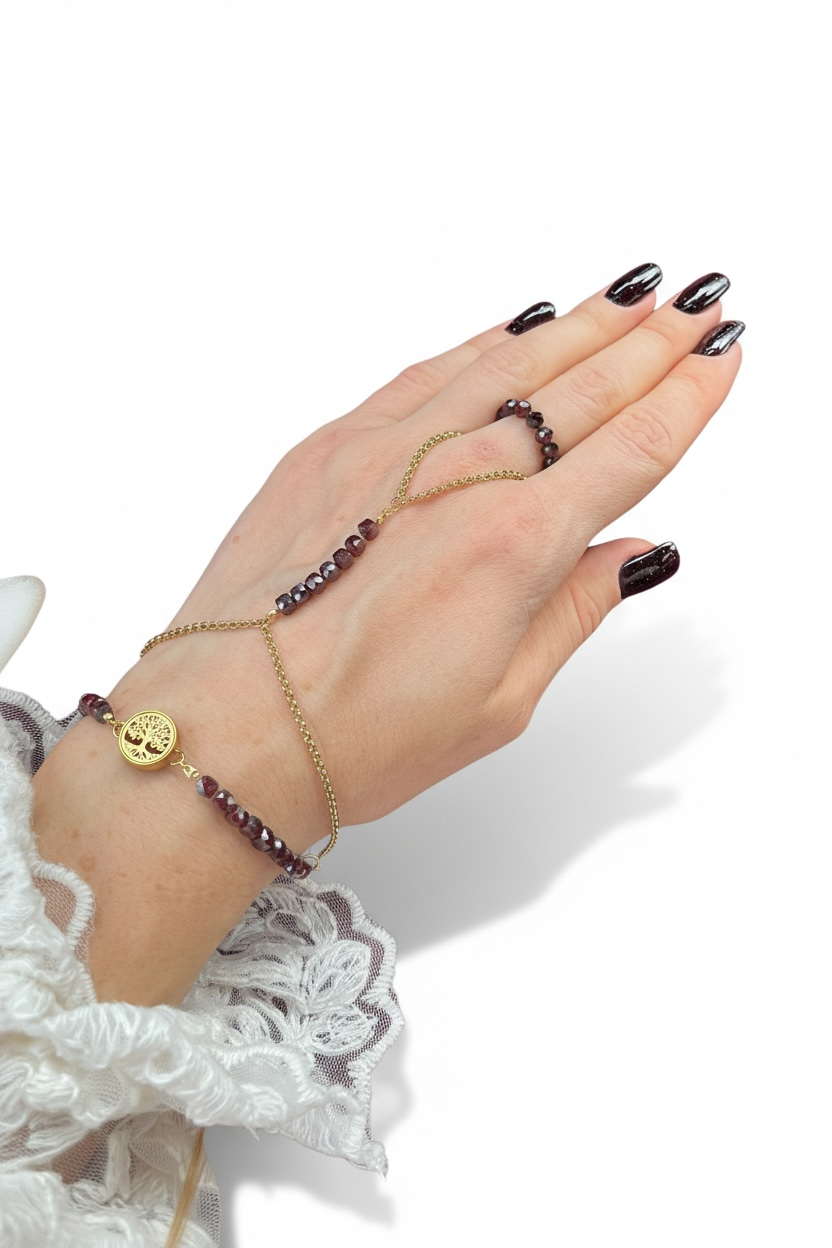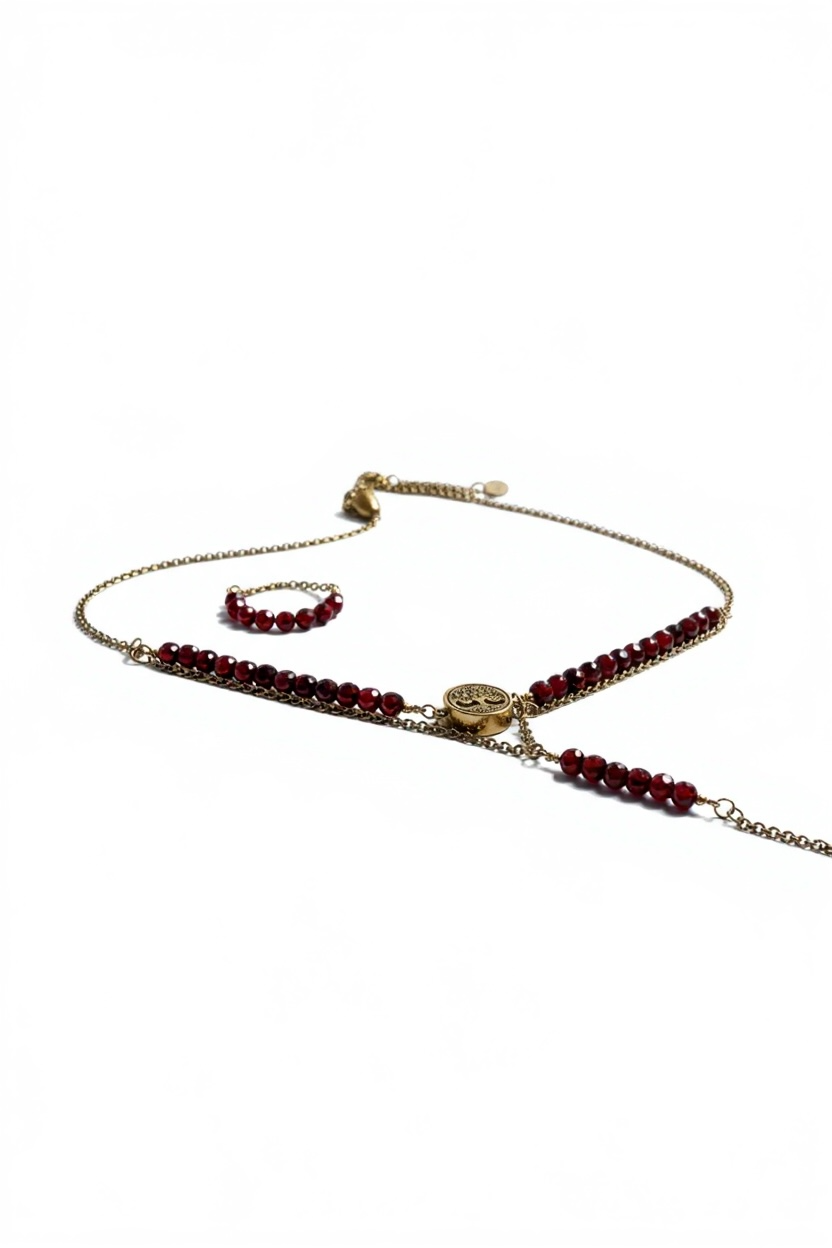 Granat to kamień odwagi, pasji i wewnętrznej siły. W połączeniu z różą i Drzewem Życia tworzy zestaw, który wzmacnia energię kobiety zakorzenionej w swojej delikatnej, ale nieustępliwej naturze.